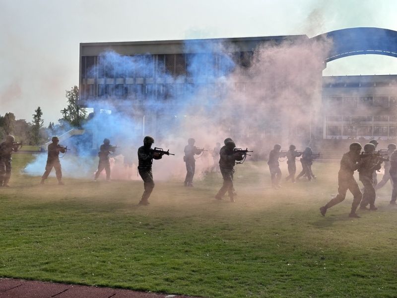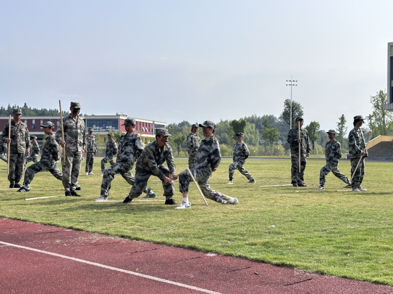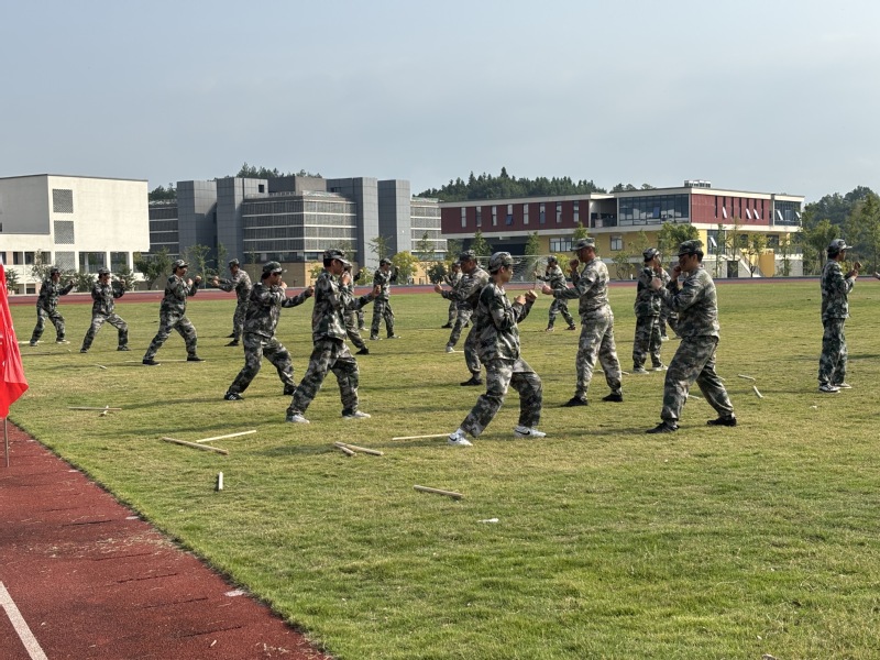 军事技能表演环节更显青春风采。战术分队表演中新生们卧倒、冲锋的身影尽显无畏担当,匕首操表演刚劲利落,摔擒棍术表演气势如虹,一招一式尽展青春锐气。